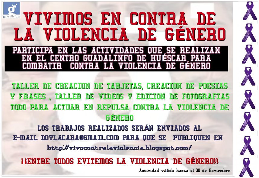 El centro guadalinfo de Huéscar organiza diversos talleres como elaboración de tarjetas, edición de fotografías y vídeos, tratado de mensajes positivos contra la violencia, taller de búsquedas en la red etc….todos relacionados con el tema y para participar en repulsa contra la violencia de género.